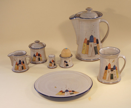 Tassen, Teller, Müslischüsseln, Dosen für Zucker und Marmelade, Milchkrüge, Kannen für Kakao und Kaffe, Eierbecher, Salz- und Pfefferstreuer, Butterdosen, Käseglocken